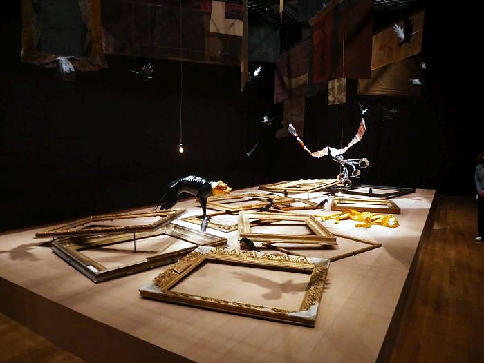 “Wonden en gif voer ik mee op mijn vlucht” van Timoteus Anggawan Kusno (1989). Mixed media installatie 2022 in opdracht van het Rijksmuseum. De titel staat voor de wil om zich te bevrijden van de kolonisator.