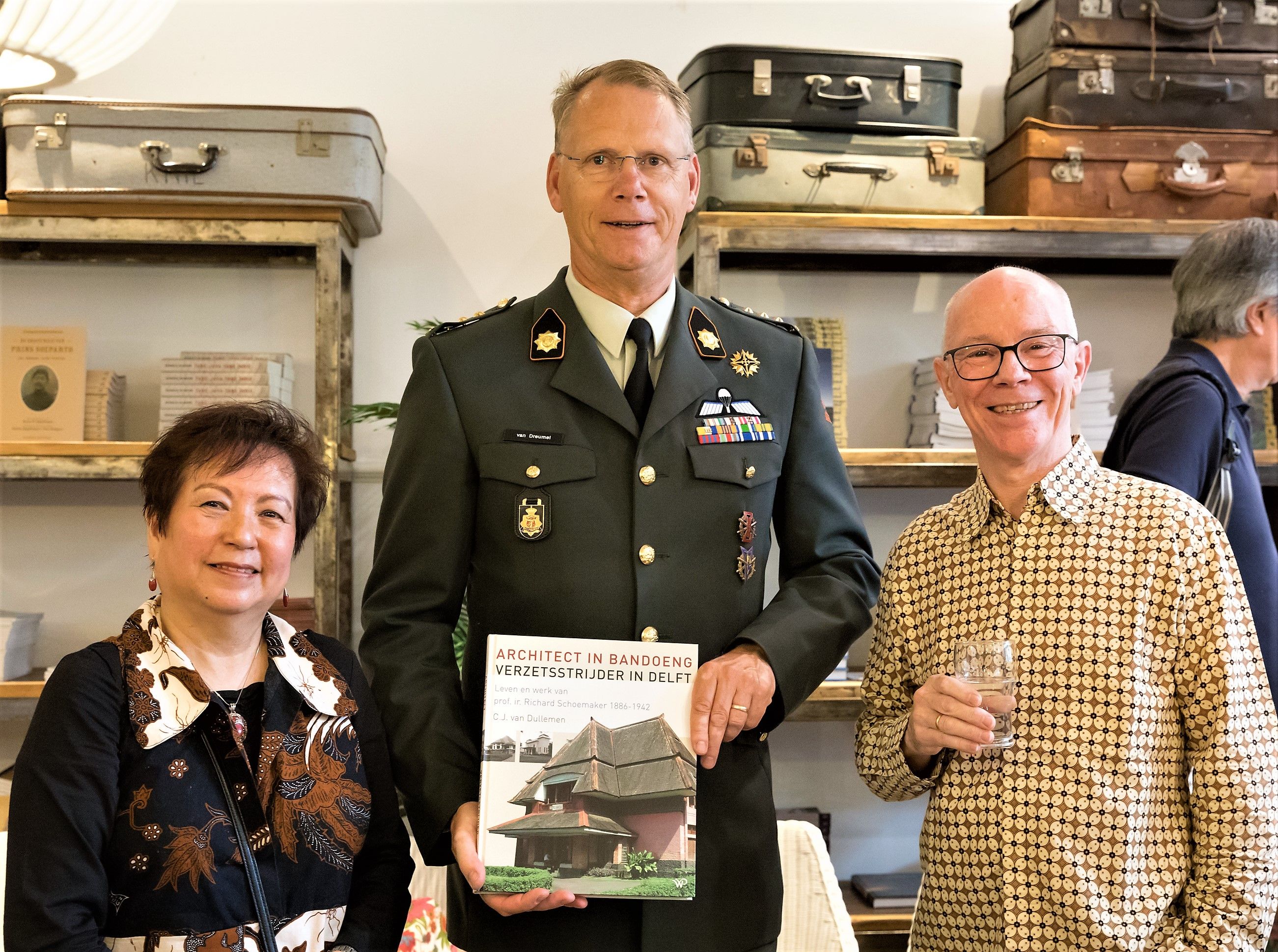Ten slotte was er een korte presentatie van de auteur zelf over het ingewikkelde en tijdrovende onderzoek dat vooraf ging aan het schrijven van het boek, gevolgd door de overhandiging van het eerste exemplaar van “Architect in Bandoeng, verzetsstrijder in Delft” aan commandant van Bronbeek, Karel van Dreumel. De bijeenkomst eindigde met een signeersessie onder het genot van een hapje, drankje en veel gezellige gesprekken.