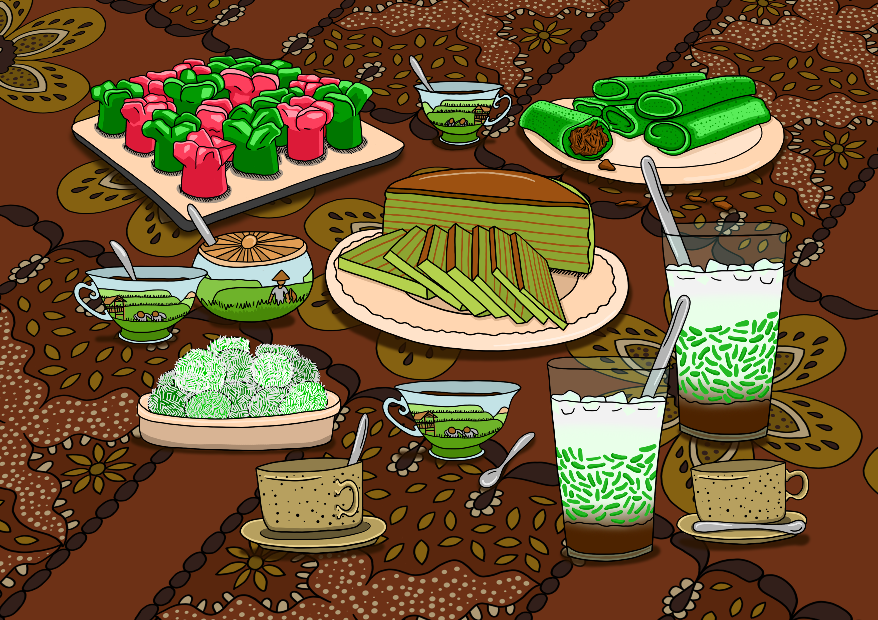 Indische snack tafel; 2021; pentekening, digitaal ingekleurd