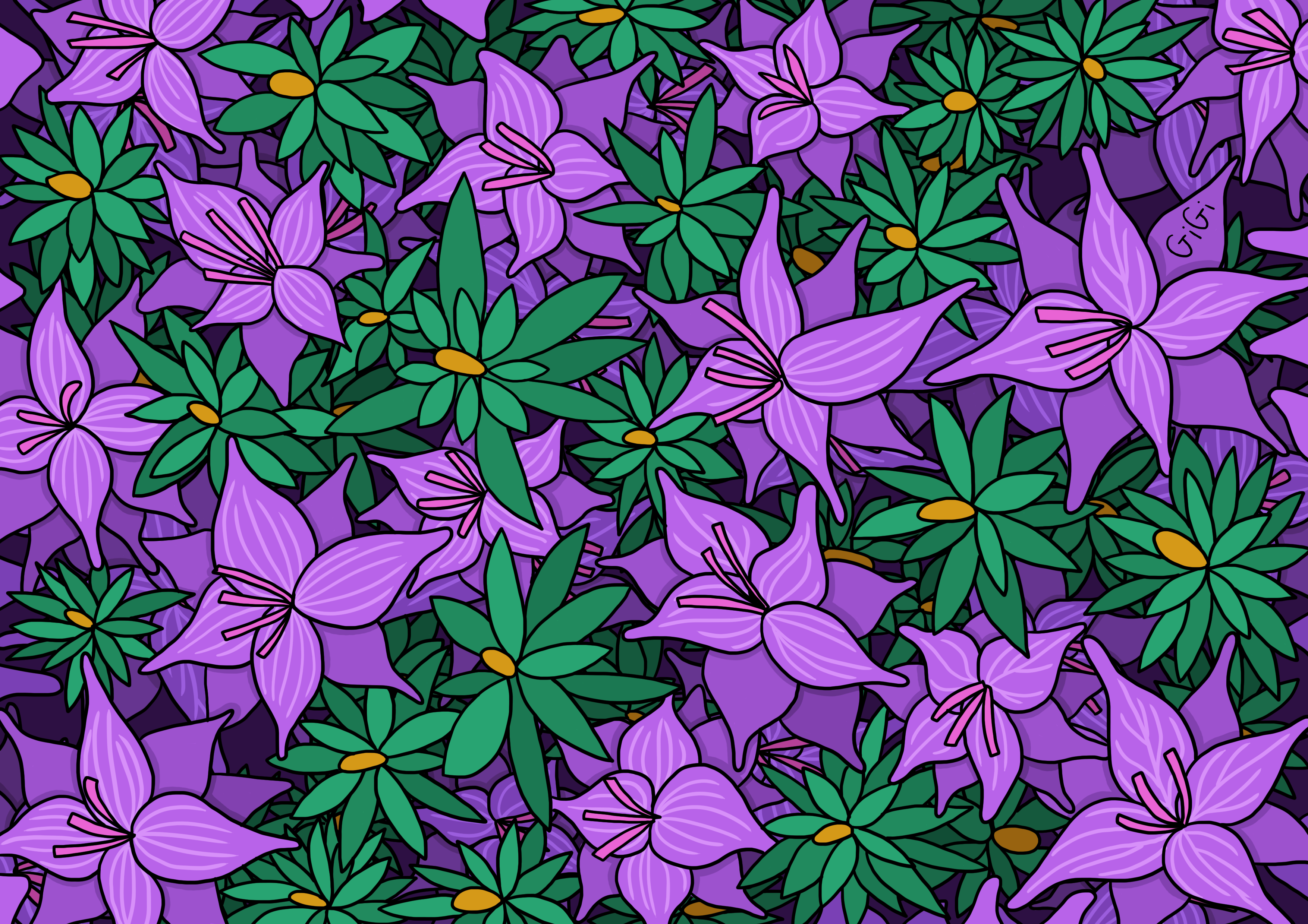 Paarse bloemen; 2021; pentekening, digitaal ingekleurd