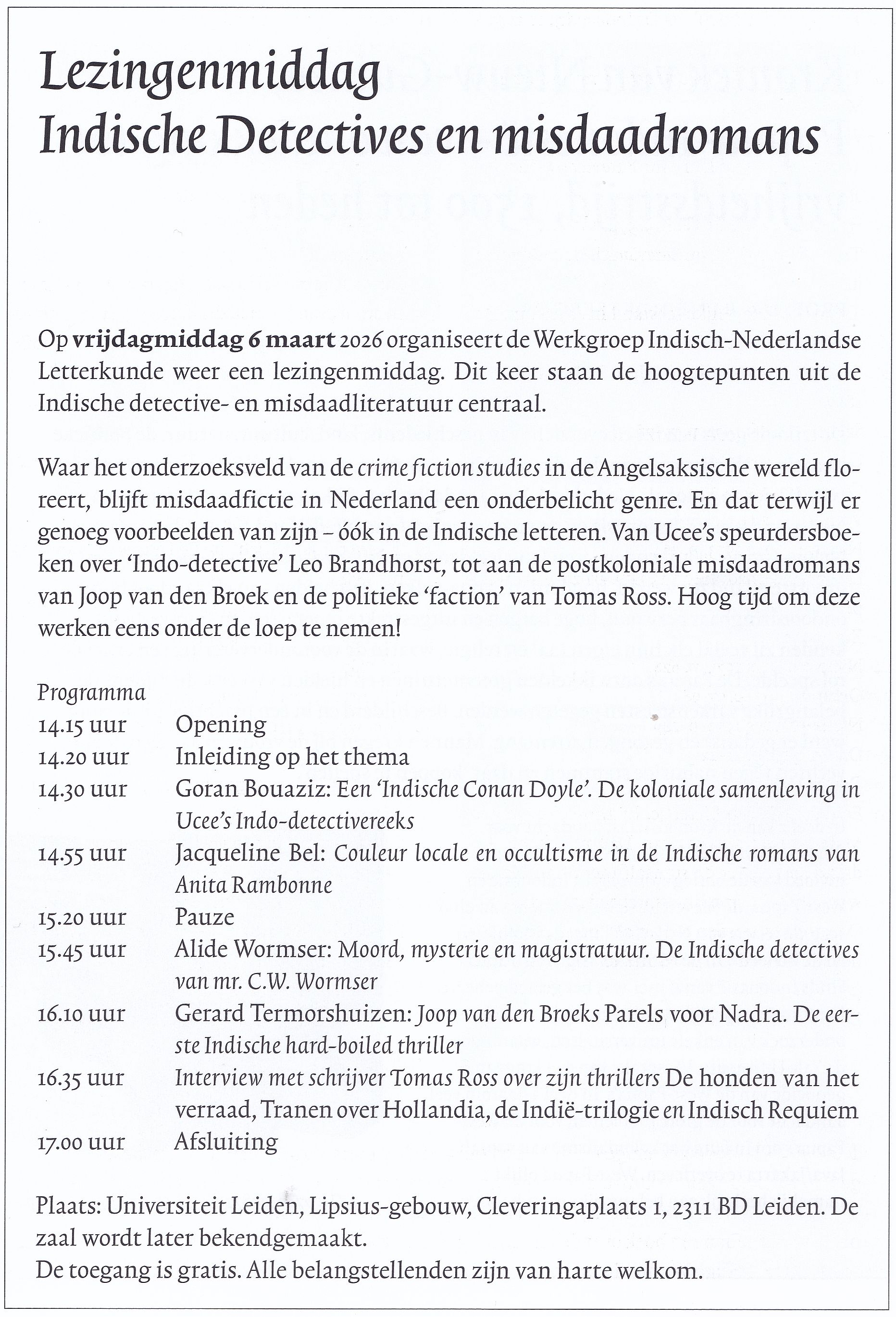 Graag vestigen we de aandacht op de eerstvolgende lezingenmiddag, die op vrijdag 6 maart 2026 in Leiden zal plaatsvinden over ‘De Indische detective’. Meer informatie hier.