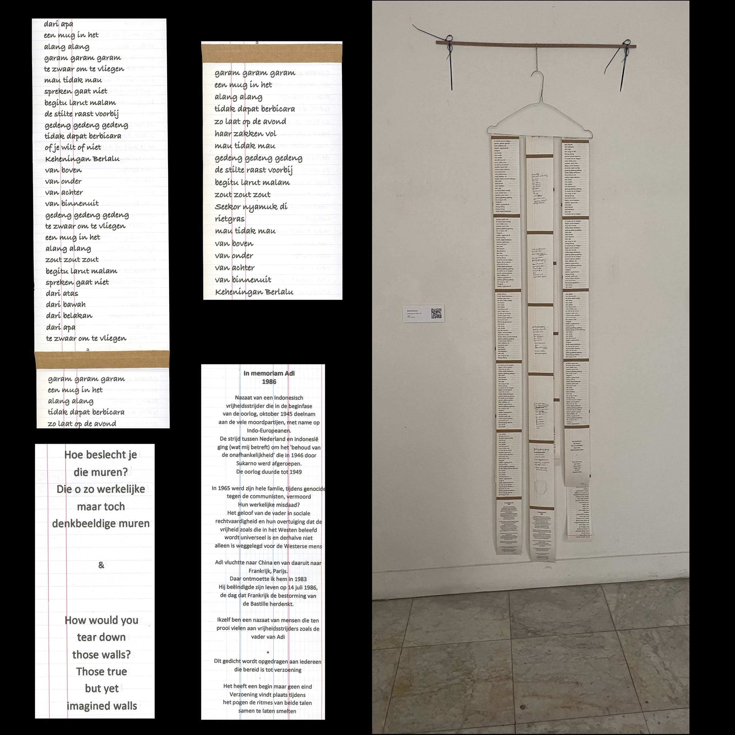 Taal als beeld en fotografie wordt voor mij steeds belangrijker. Twee jaar gleden heb ik eindelijk een gedicht afgemaakt dat jarenlang op de plank heeft gelegen. Het is geschreven in twee talen door elkaar, Bahasa en Nederlands. Uitgangspunt: verzoening als daad. Titel van het gedicht: “Een mug in het alang alang”. Het gedicht zelf is 16 meter lang. Het heeft een begin, maar geen eind.