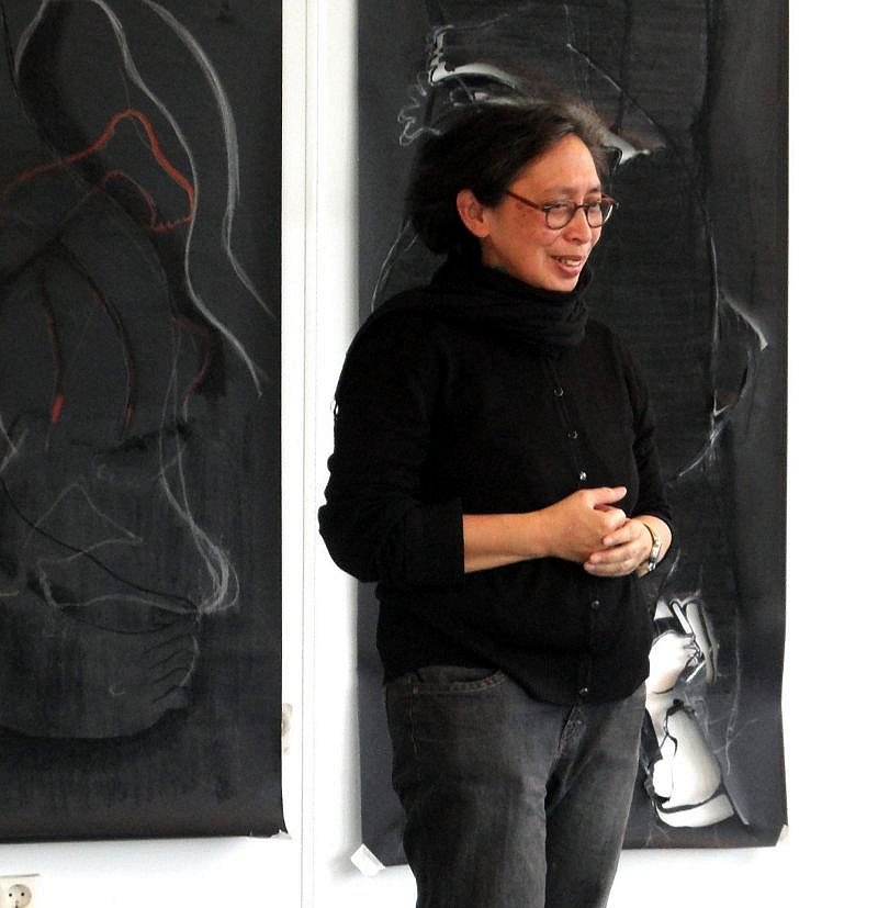 In Juni’s werk beweegt ze zich op de grens tussen het figuratieve en abstracte. Het is een spel van zwart en wit met strakke en vage lijnen. Zij tekent en vlakt weg en dat herhaalt zich totdat er een evenwicht ontstaat. Als zij tekent gaat het alleen om haar hand, het papier en het materiaal. Zo brengt zij ook nieuwe lijnen aan op ouder werk en ontstaat er laag na laag een evenwichtig beeld.