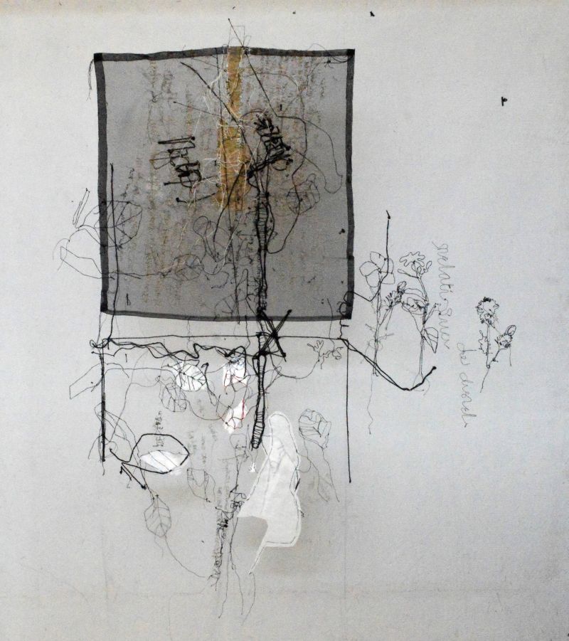 Rechts: ONAFHANKELIJK: Garens, patroonpapier op tule; 100 x 115 cm