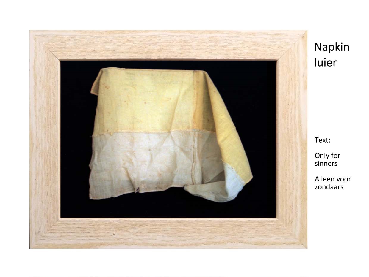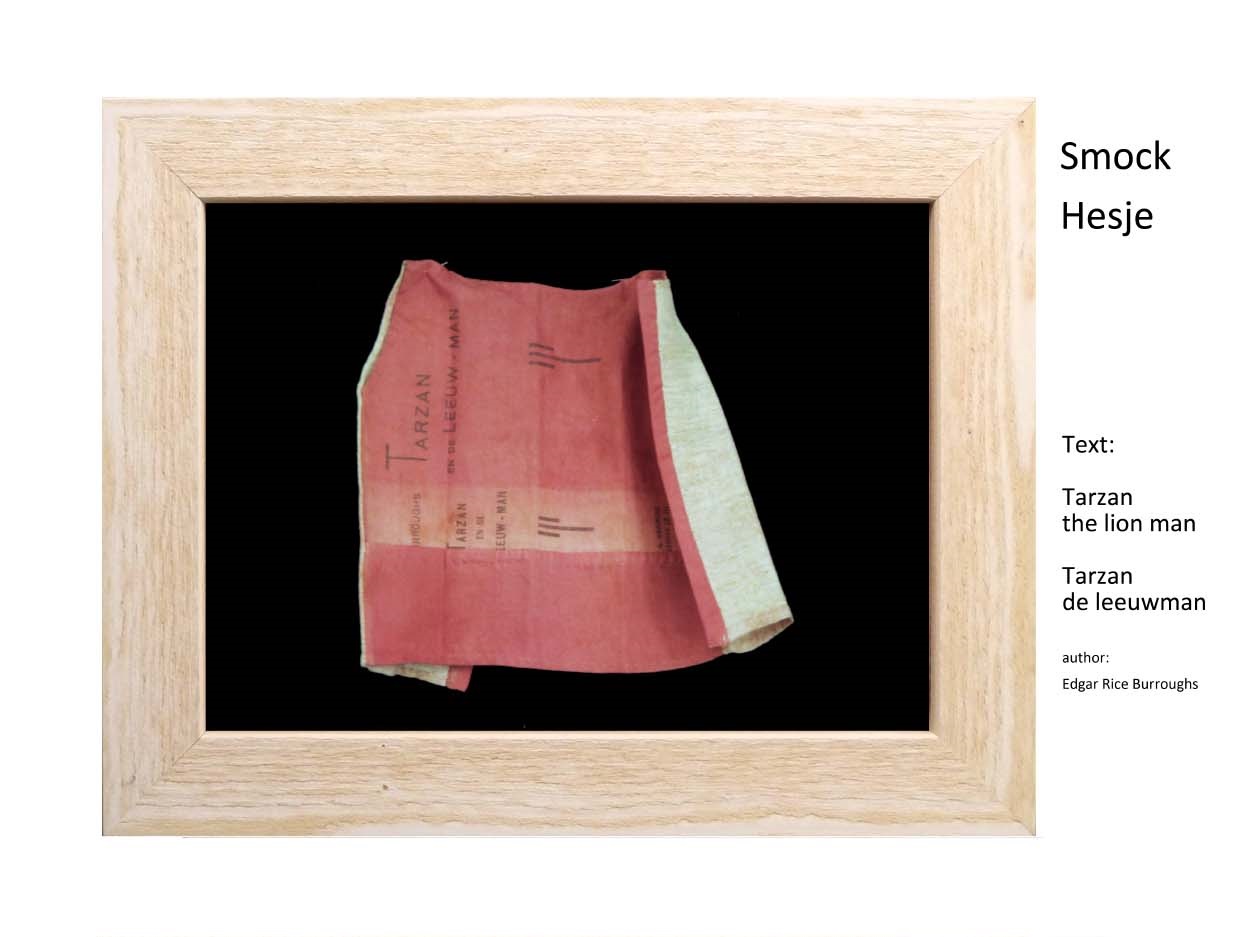 Op mijn kussentje staat in spiegelbeeld: De stem van het geweten. Mijn verschoten hesje draagt de titel: Tarzan de Leeuwman. De naam van de schrijver, Burroughs, verdwijnt halverwege de naad. Op een van de luiers staat nog te lezen: Alleen voor zondaars.