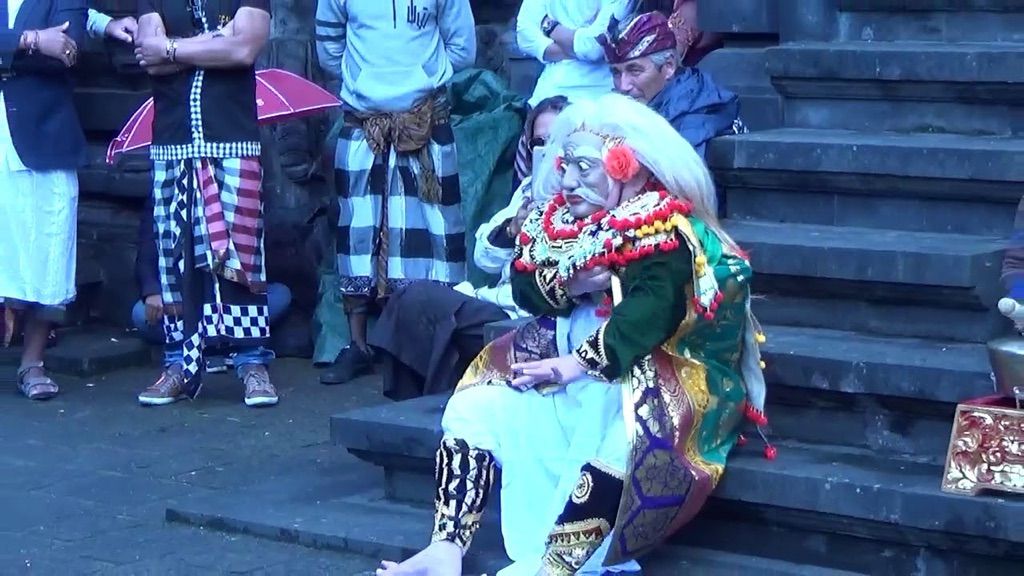 Tari Topeng Tua (dans van een oude man) tijdens de Balinese Saraswati viering bij de tempel Pura Agung Santi Bhuwana in Pairi Daiza, Brugelette, België.