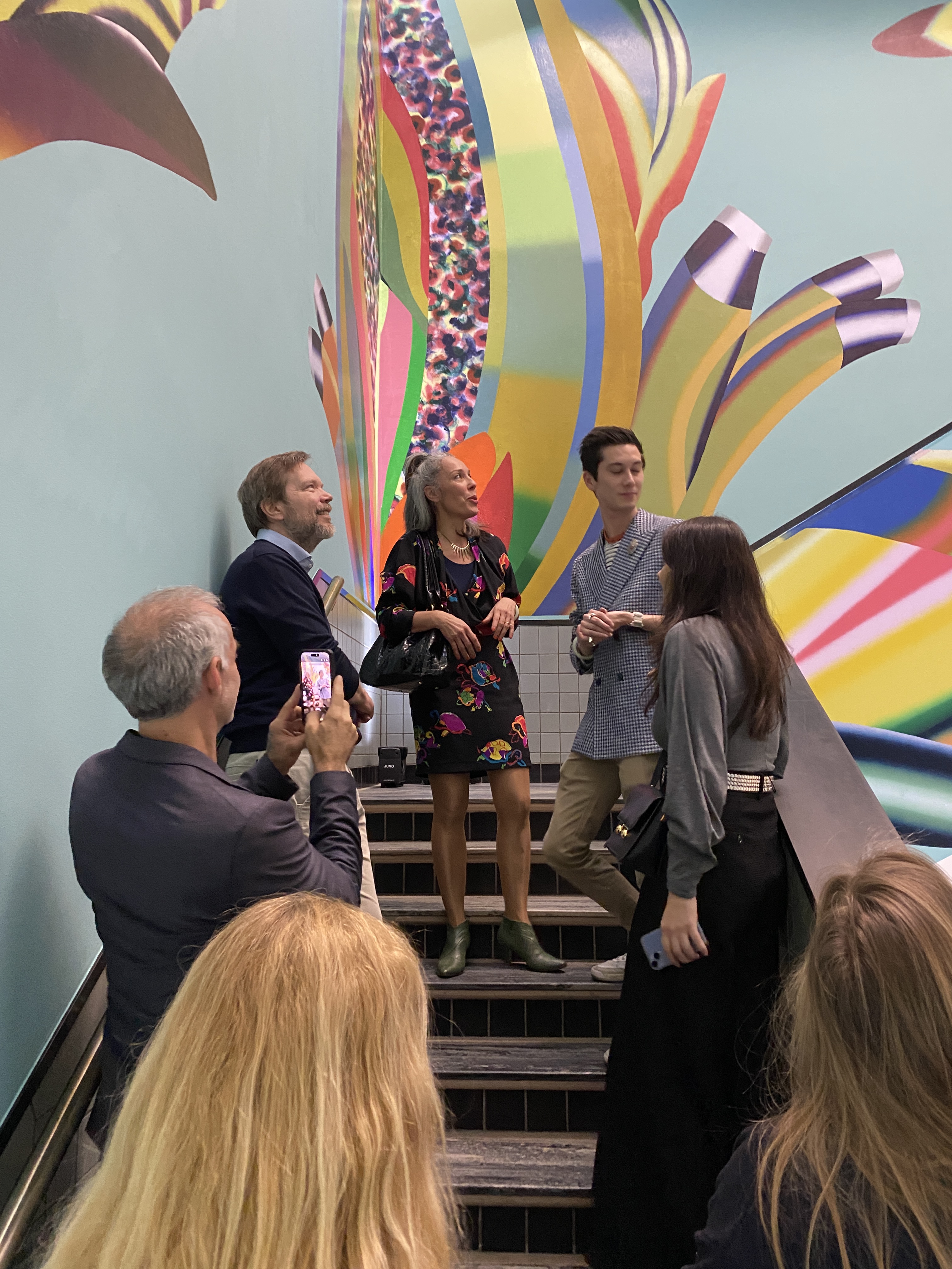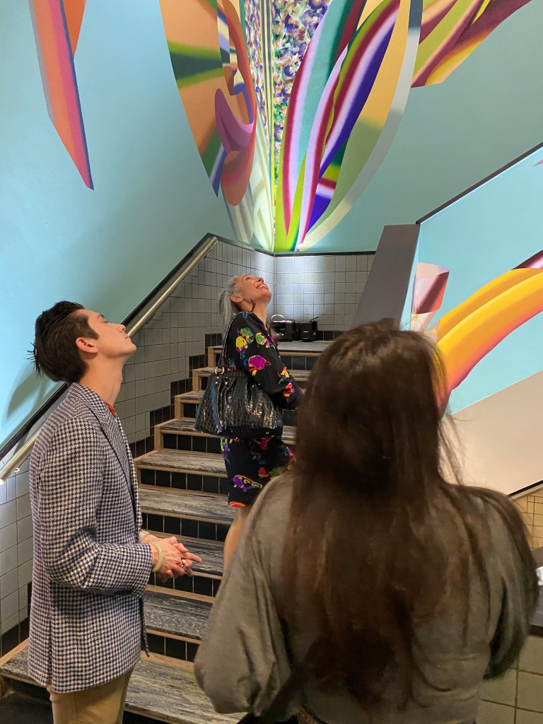 Daarna ben ik met een klein groepje met Hadassah mee geweest naar het trappenhuis om haar muurschildering te bekijken en waar ze het één en ander heeft uitgelegd over haar motivatie en de manier waarop de muurschildering tot stand is gekomen.