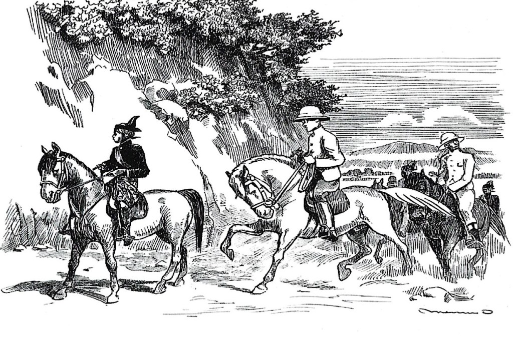 Op weg naar de plaats van een misdrijf. V.l.n.r. het dorpshoofd, Wormser en de griffier.