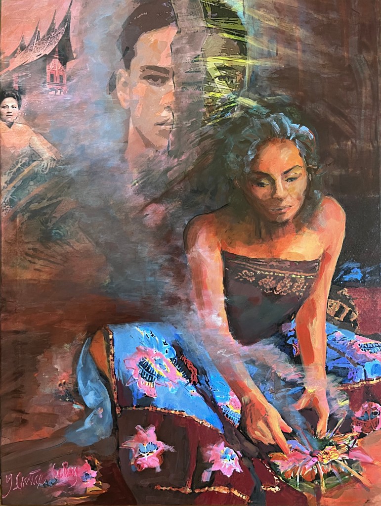 De tentoonstelling ‘Roots and Rituals’ gaat over reizen en rituelen uit landen in Azië, die Josje Crince Le Roy bezocht heeft (zowel schilderijen als foto’s) en met name Indonesië (geboorteland van haar vader, toen Nederlands-Indië). Haar persoonlijke (Indische) wortels worden getoond in o.a. de indrukwekkende schilderijen ‘Blue sarong’, ‘Mijn grootmoeders sarong’ en ‘For my ancestors’.