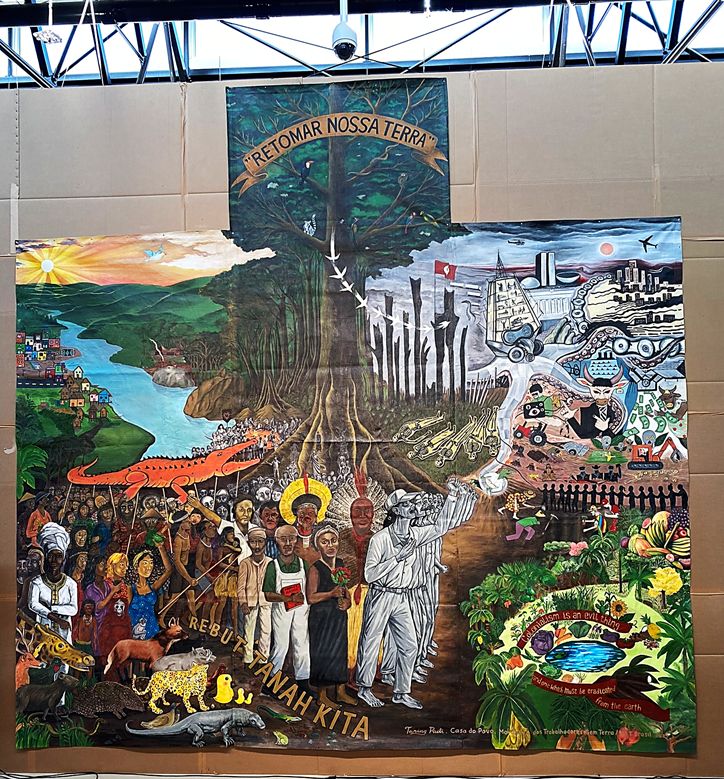 De tentoongestelde werken van Taring Padi en hun collega-kunstenaars zijn diep geworteld in hun gedeelde ervaringen met complexe vraagstukken rondom landgebruik en landverdeling. Met behulp van co-creatie hebben ze indrukwekkende kunstwerken gemaakt, variërend van houtsnedenposters en imposante spandoeken tot levensechte kartonnen poppen. Deze kunstwerken hebben land als centraal thema in de anti-koloniale strijd, waarbij ze verwijzen naar zowel het koloniale verleden van Nederland als de hedendaagse gevolgen die nog steeds voortduren. Ze belichten kwesties zoals de exploitatie van natuurlijke hulpbronnen, de dominantie van de agro-industrie, militair ingrijpen en geweld, juridische strijd tegen landroof en de verwoesting van biodiversiteit.